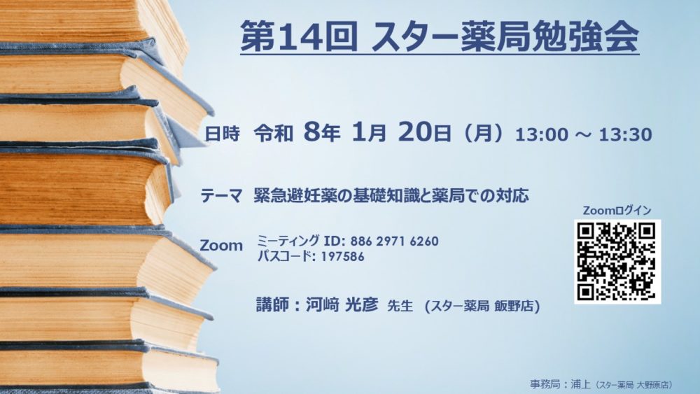 2026年1月20日、オンラインにて第14回スター薬局勉強会を開催しました。今回は「緊急避妊薬の基礎知識と薬局での対応」をテーマに、スター薬局 飯野店の河﨑光彦先生より講義いただきました。制度の概要から実際の対応フローまで具体的な解説があり、参加者は日常業務に直結する知識を深める貴重な機会となりました。スター薬局では、今後全店舗で緊急避妊薬の販売対応を行う予定としており、引き続き研修を重ねながら、地域の皆さまに安心してご相談いただける体制づくりを進めてまいります。