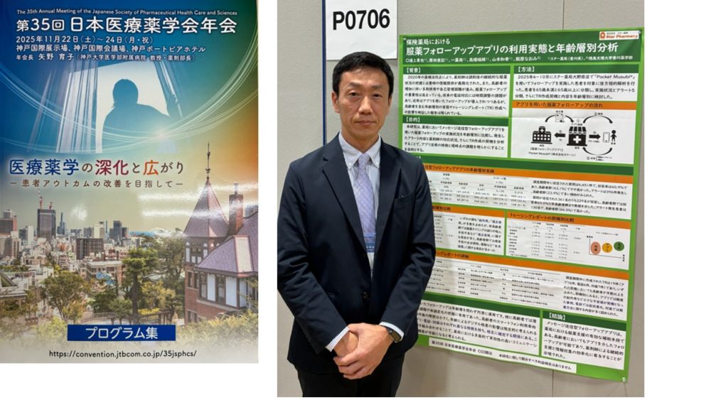 第35回日本医療薬学会年会にて、メッセージ送信型フォローアップアプリ「Pocket Musubi®」を用いた服薬フォローアップの実態と年齢層別の特徴について発表しました。アプリは高齢者を含め円滑に運用でき、潜在的な副作用や生活面の変化を早期に把握できることが示されました。また、アプリ・電話・対面を組み合わせることで、多面的で実効性の高いコミュニケーション体制の構築につながることを報告しました。